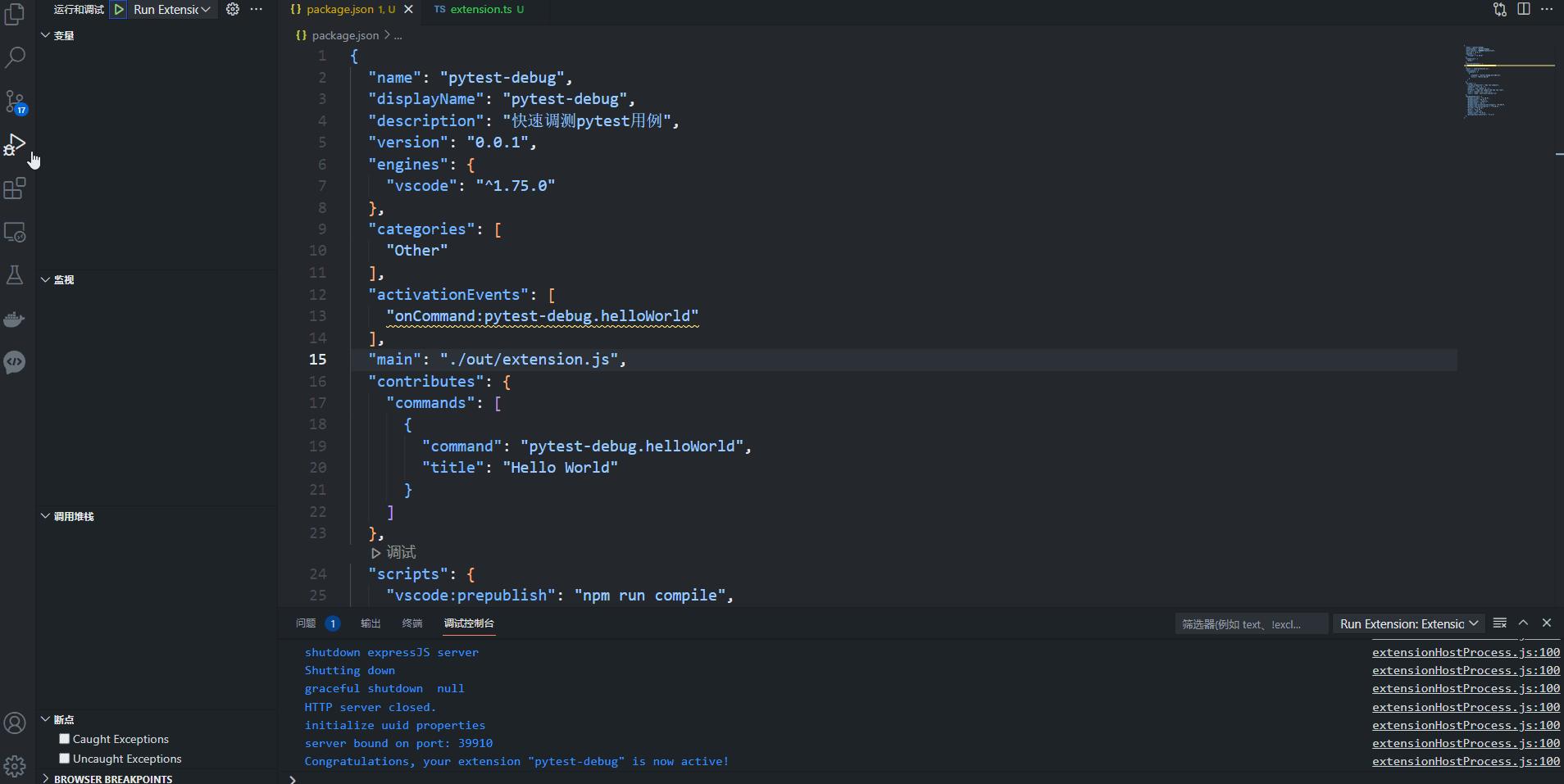 不改动任何代码,先调试一下插件,左侧导航栏进入运行与调测,点击运行会新打开一个新的VS Code窗口,Ctrl+Shift+P组合键打开命令面板,输入Hello World命令执行后,右下角会弹出一段消息框“Hello World from pytest-debug!”,这就是extension.ts中定义的回调方法中运行的代码。