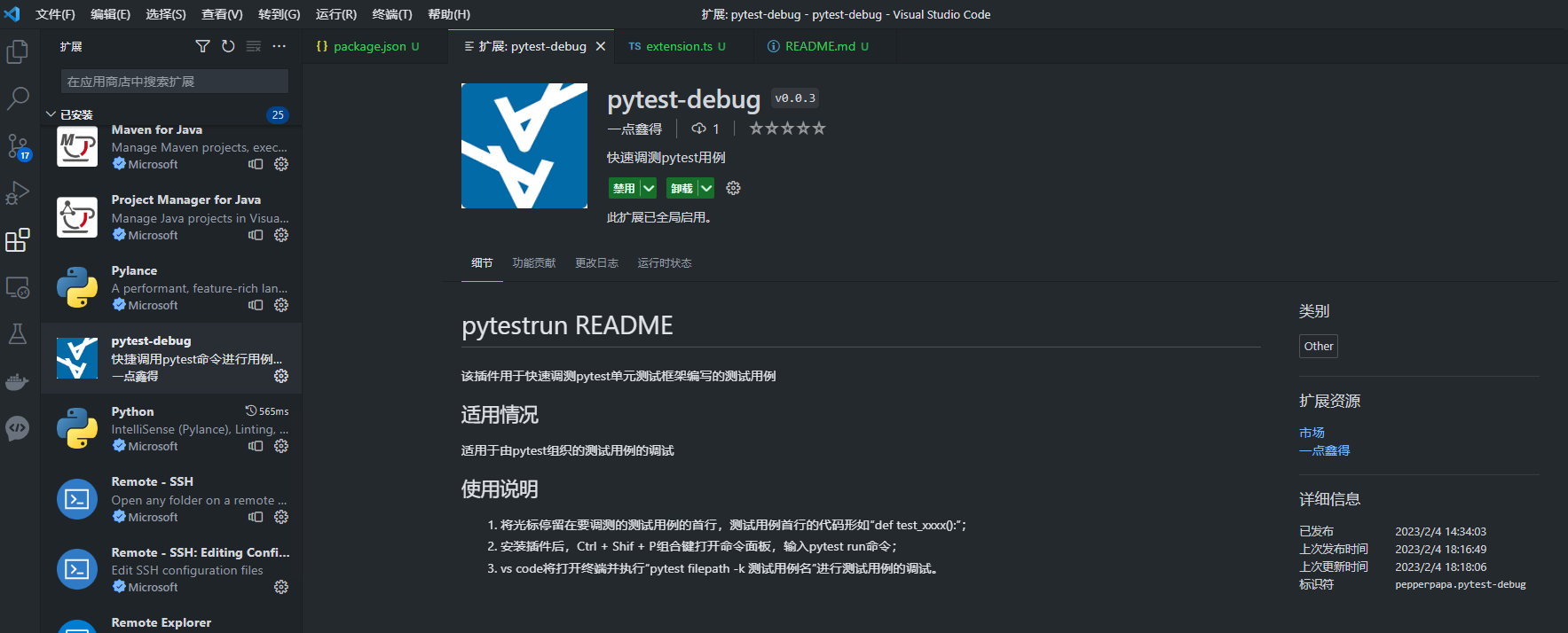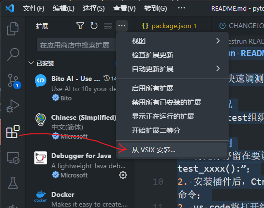 打包成功后,会在插件根目录下生成pytest-debug-0.0.1.vsix文件,如果你只会在本地使用此插件,可以直接选择.vsix安装即可
