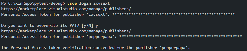 执行vsce login publisher_name( publisher_name为package.json设置的publisher的值,即发布者ID),这里需要输入创建的令牌进行认证