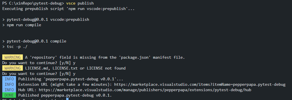 调试代码直到满足了预期的需求之后,就可以打包和发布你的插件了,官方提供vsce命令行工具简化插件打包发布流程。
